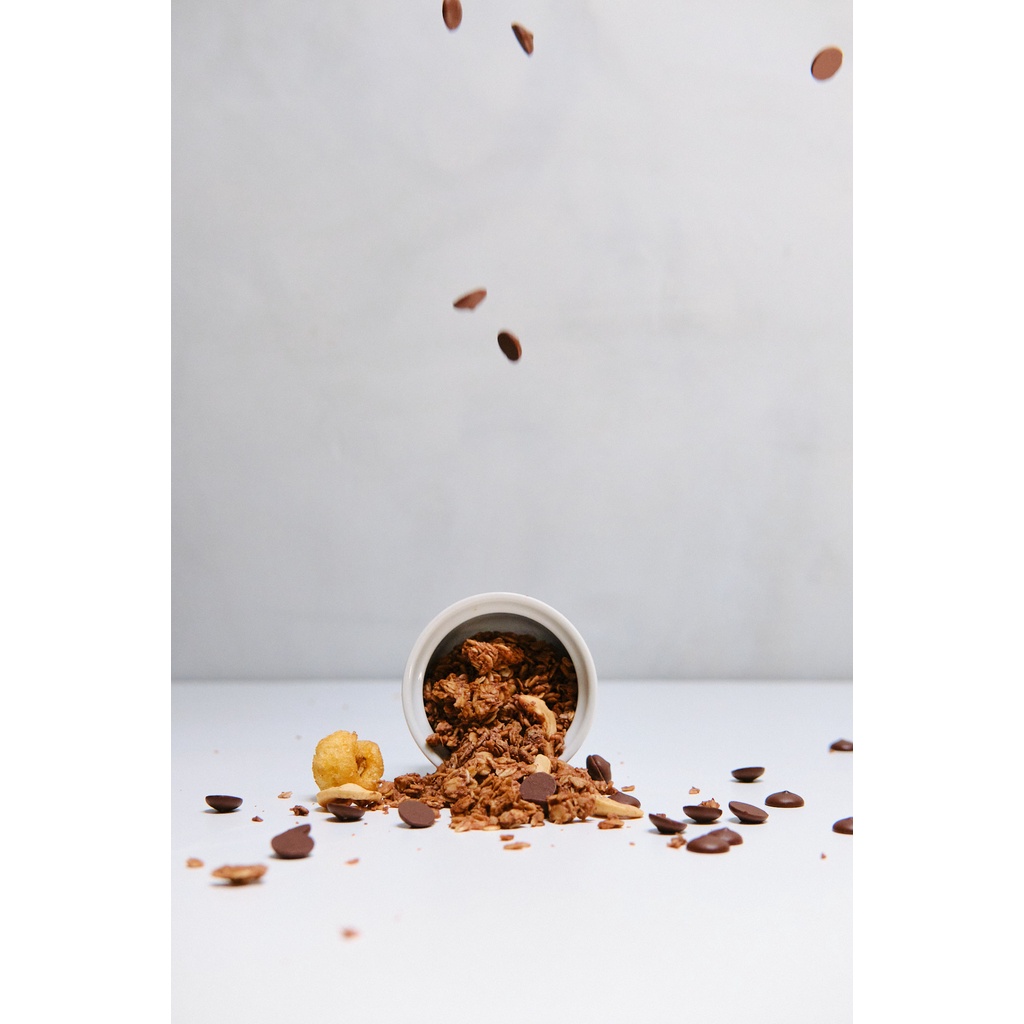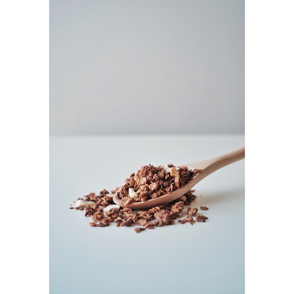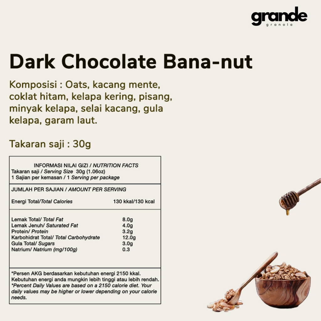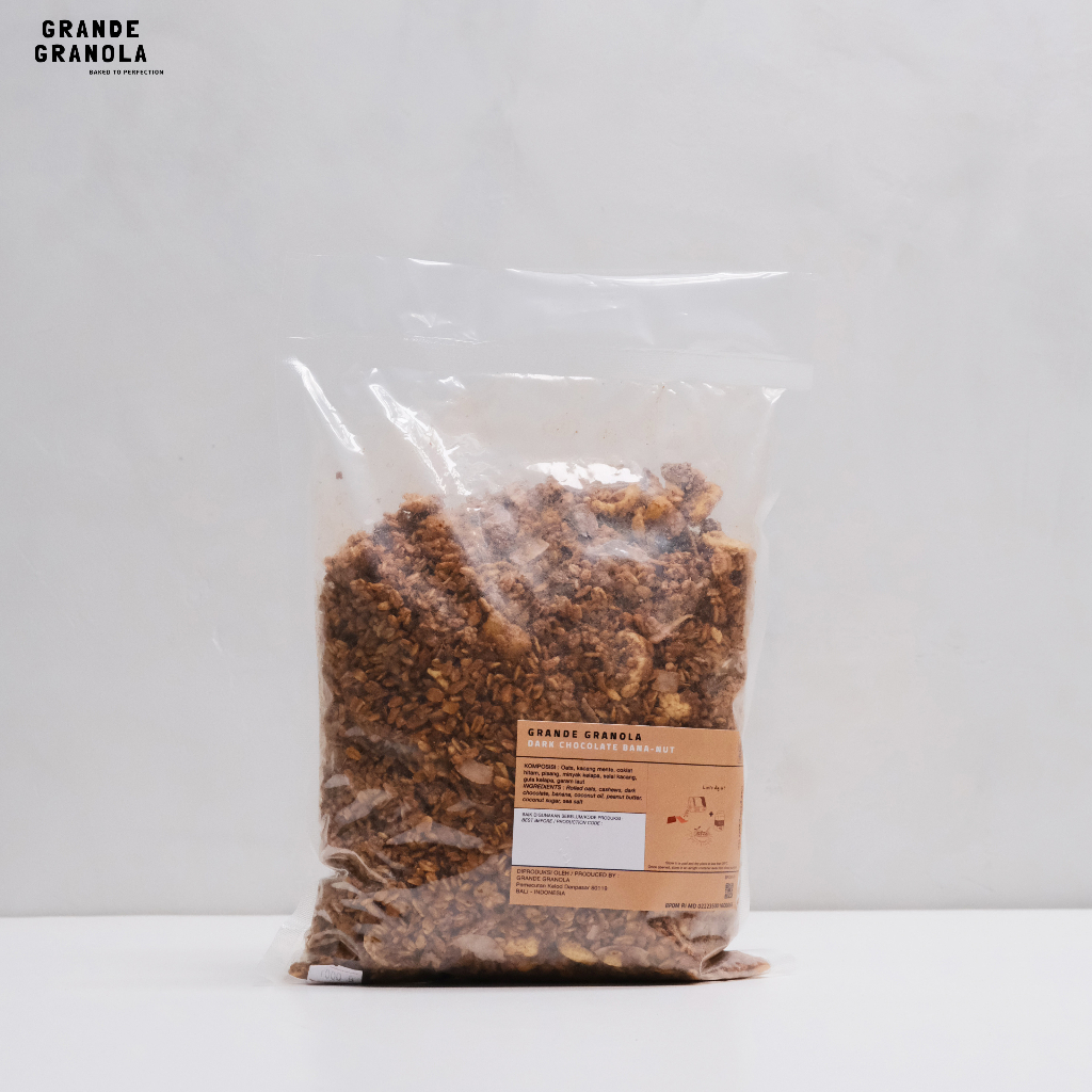 Grande Granola Dark Chocolate Banana Nut is a rich blend of oats, roasted cashews, creamy peanut butter, dark chocolate, coconut flakes, and real banana—balanced with desiccated coconut, coconut oil, natural coconut sugar, and a touch of sea salt. It’s perfect with yogurt, milk, or smoothie bowls, and just as indulgent straight from the bag as a snack. With a crunchy texture and a sweet-salty flavor combo, it’s a comforting treat any time of day. To keep it fresh, store at room temperature in an airtight container, away from direct sunlight.