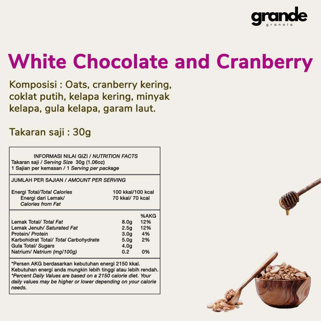 Grande Granola White Chocolate and Cranberry blends wholesome oats with tangy dried cranberries, creamy white chocolate, coconut flakes, coconut oil, natural coconut sugar, and a touch of sea salt. It’s delicious with yogurt, milk, or smoothie bowls, and just as satisfying as a sweet snack on its own. With a light, crunchy texture and a hint of indulgence, it’s a treat you can enjoy any time of day. To keep it fresh, store at room temperature in an airtight container, away from direct sunlight.